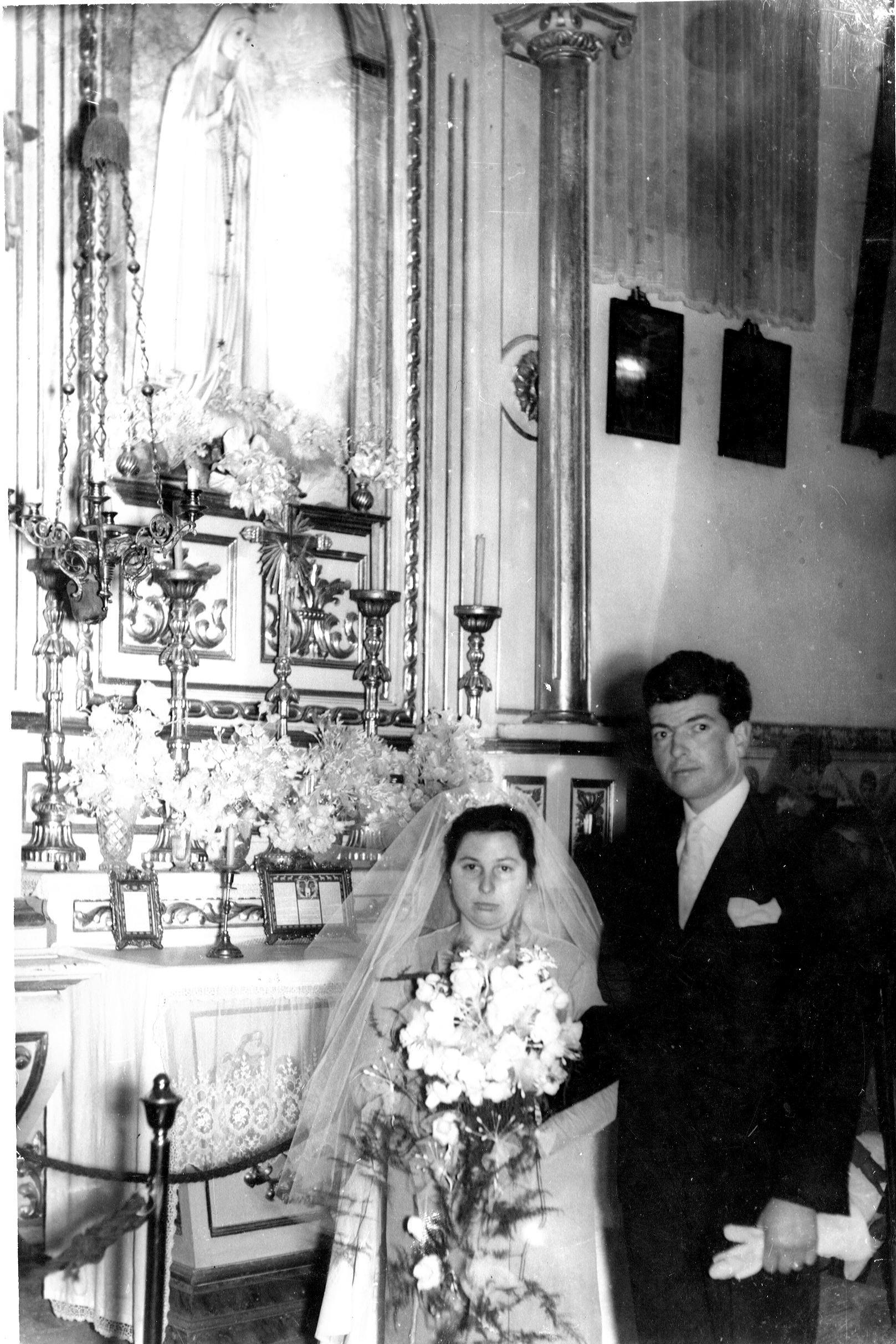 Casamento de António Oliveira Machado com Ana de Lourdes Oliveira Chaminé. António Oliveira Machado e Ana de Lourdes Oliveira Chaminé, em frente ao altar de Nossa Senhora de Fátima, na Igreja de Santa Marinha Afurada, no dia do casamento. | 1961-01-15 | Igreja Santa Marinha Afurada | |||